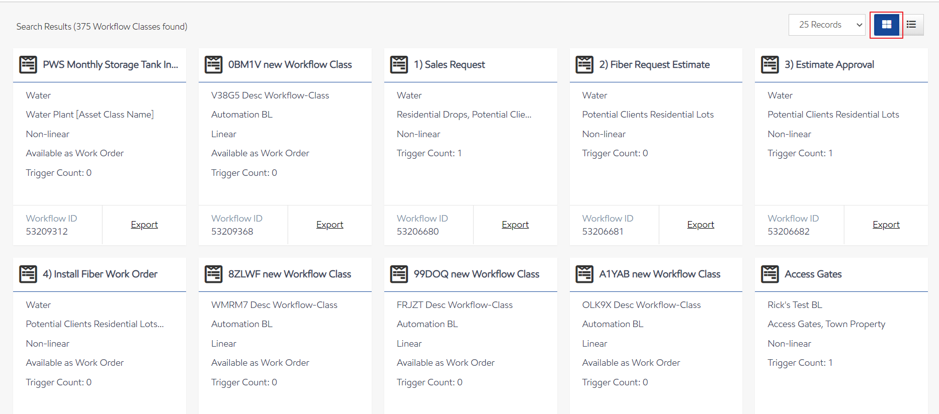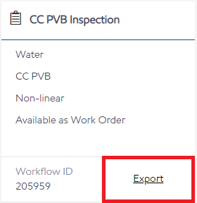 To Export an Workflow Class, search for the Workflow Class and select the Export link on the tile.
