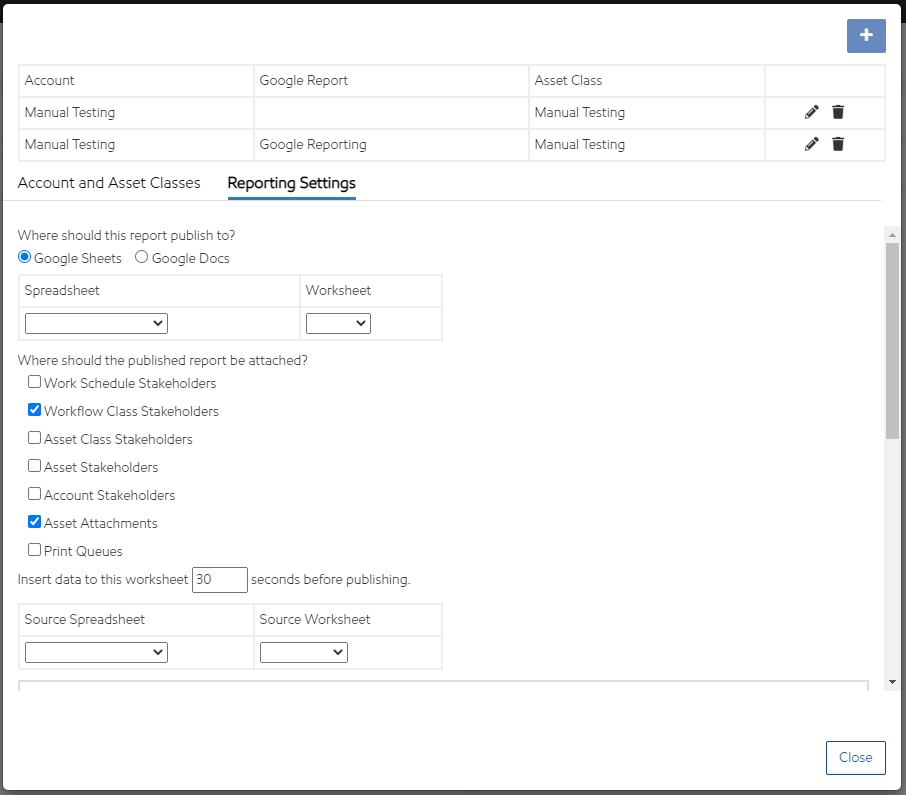 Select theSource Spreadsheetand theSource Worksheetto publish data. Select a spreadsheet and worksheet that will capture the completed workflow and asset attribute data when the work has been completed. It is recommended to create an empty worksheet in a Google Sheet and label it "Data".